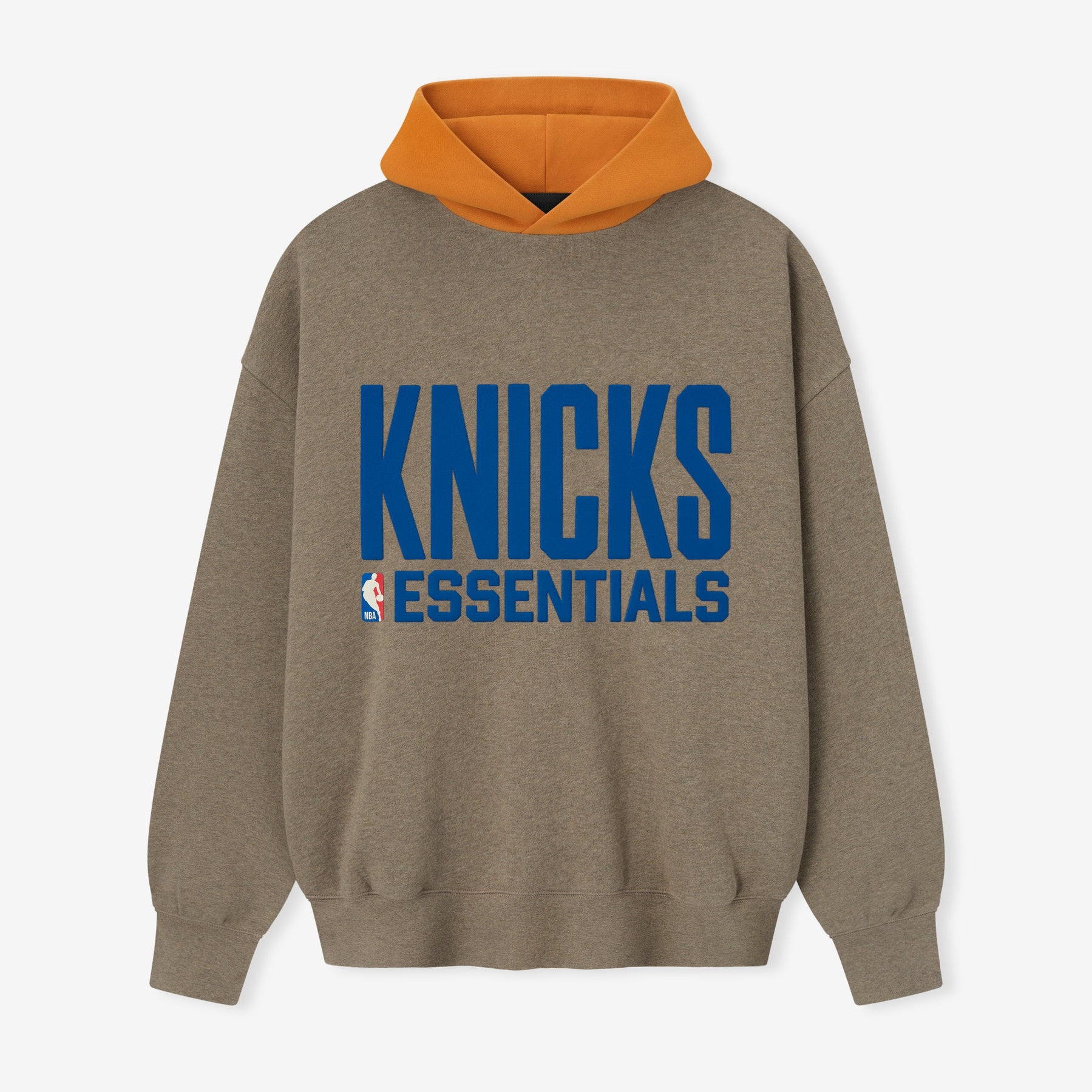 The Knicks Sport Hoodie is crafted from core fleece, offering an elevated balance of softness, structure, and lasting comfort. Cut in a relaxed sport fit, it drapes with more ease through the body and extended length compared to the Essentials classic silhouette. The front features a bold puffer-print graphic "Knicks Essentials " alongside the authentic NBA logo, while the back showcases the "New York" logo. Additional features include contrasting hood, side pockets, rib-knit at the cuffs and waist hem. The signature rubberized Fear of God Essentials label accents the hood.